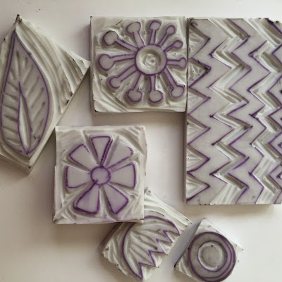 I've been inspired by other people's stamp making, after a few years of playing with mixed media art and seeing stamps that other people have made. I have a background of dabbling in printmaking, so if I'm honest, to begin with I was a bit snobby about making your own stamps. I thought they were the dumbed down version of relief printing. I also am a bit averse to using other people's stamps in my work because it doesn't feel like mine. I know some people use heaps of stamps and love them, and create great effects using them, I don't have any problem with that, it's just a personal preference for me. But anyway, to cut a long story short, I felt the need to try making some stamps, and around the same time I rediscovered a very soft, rubber carving plate I had bought for printmaking - and voila! the project was born.
